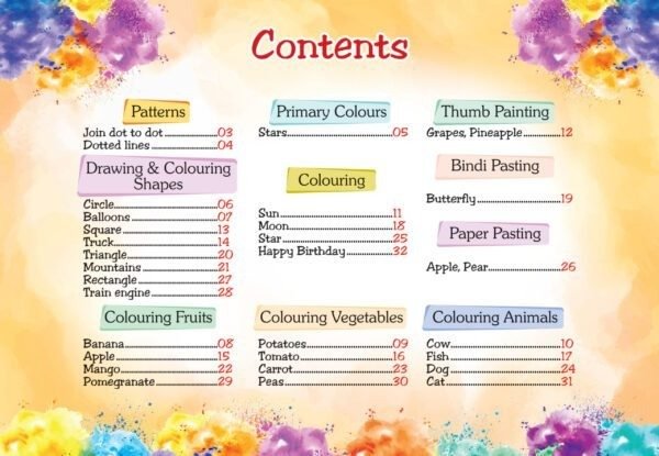 The series includes various activities of drawing, colouring, tracing painting, pencil shading, paper cutting, paper folding, paper craft, pasting objects, making impression, pattern making using different techniques like air blowing technique, etc.