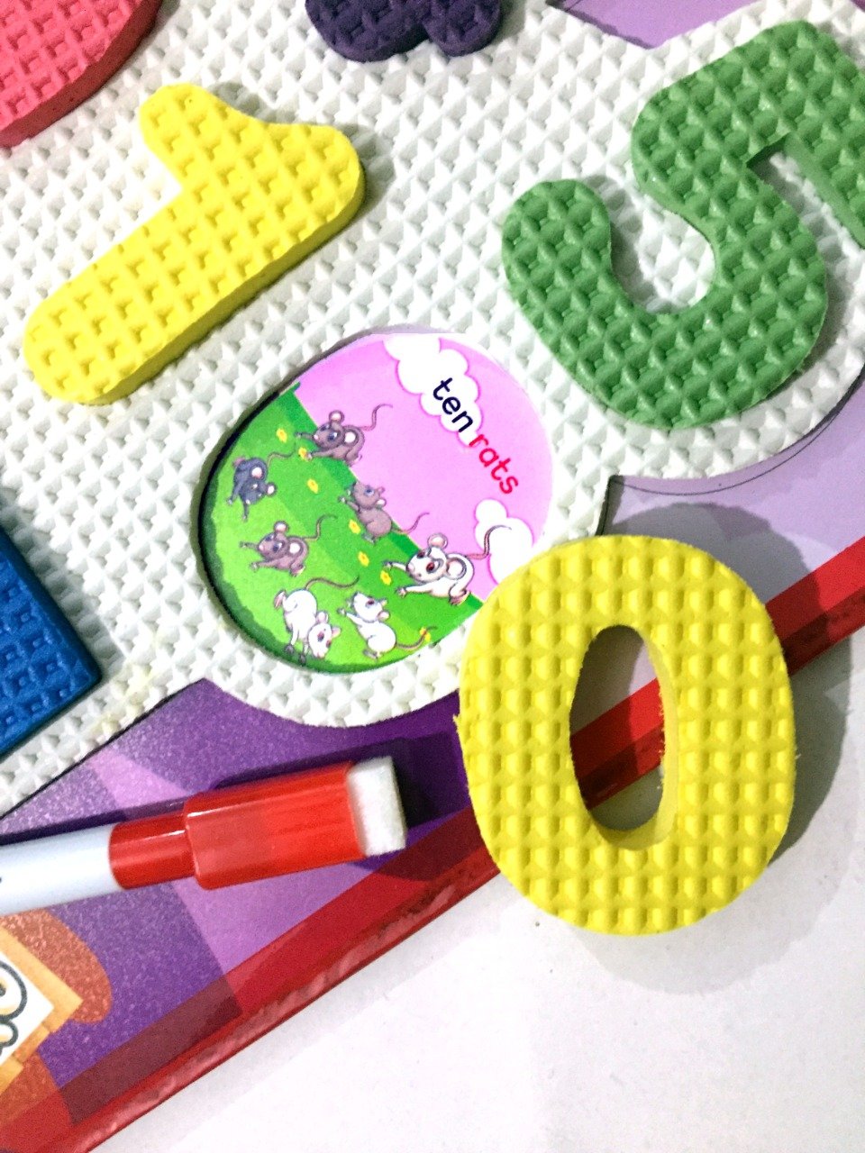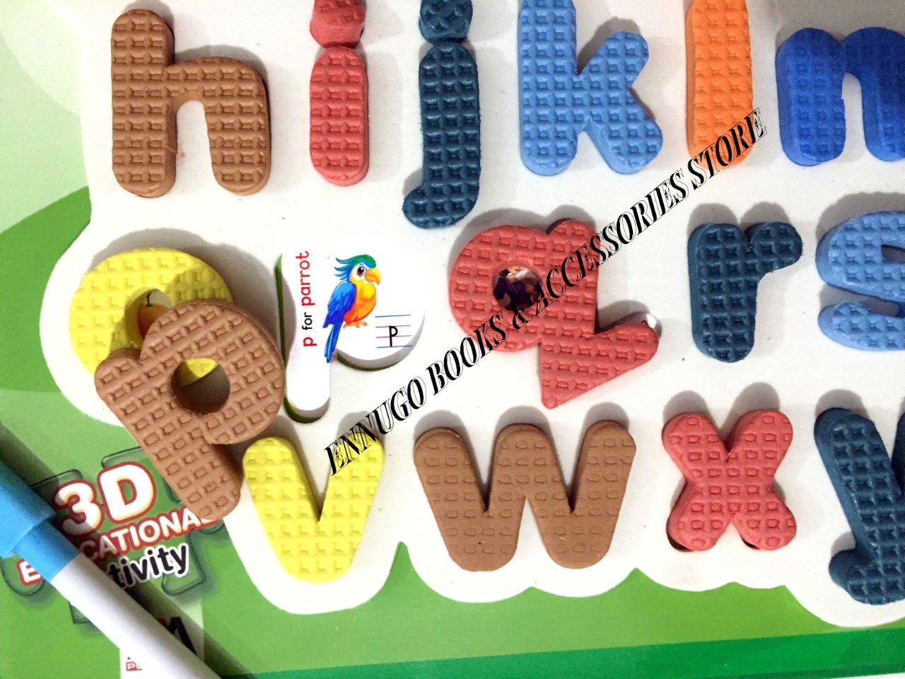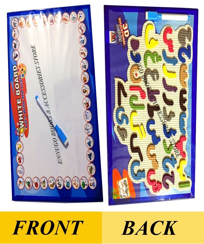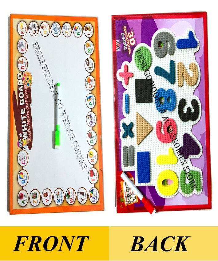 The reverse side includes colorful 3D foam puzzle pieces with alphabets, numbers, mathematical symbols, and basic shapes, helping children learn recognition, counting, and problem-solving skills. Made with child-safe materials and vibrant colors, this set encourages creativity, fine motor skill development, and independent learning.